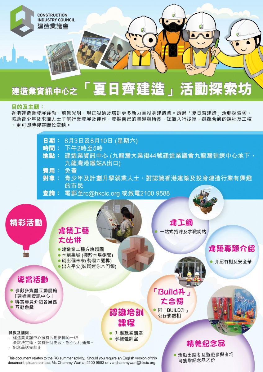 建造業資訊中心在 8 月 3 日 及 10 日兩個星期六舉行「夏日齊建造」活動探索坊,活動除得到新家園協會的鼎力支持外,中心亦邀請各青少年中心的服務對象出席,活動吸引近 250 位參加者。活動旨在吸引包括內地新移民、少數族裔及本地青少年等新力軍投身建造行業,透過導賞、升學及就業講座、工種介紹、小型工藝比試及遊戲等,提供行業前景、工種運作、晉升階梯、升學及就業培訓課程等資訊,活動當日更即場示範招聘及求職配對平台─「建工網」的服務及功能。
