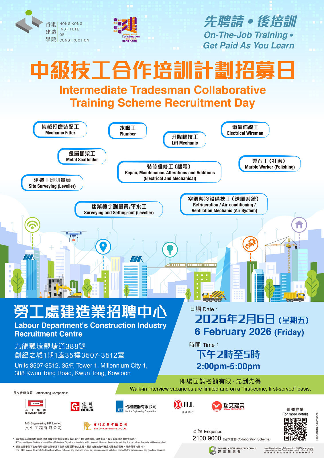 地点:观塘劳工处建造业招聘中心(九龙观塘观塘道388号创纪之城1期1座35楼3507-3512室 )